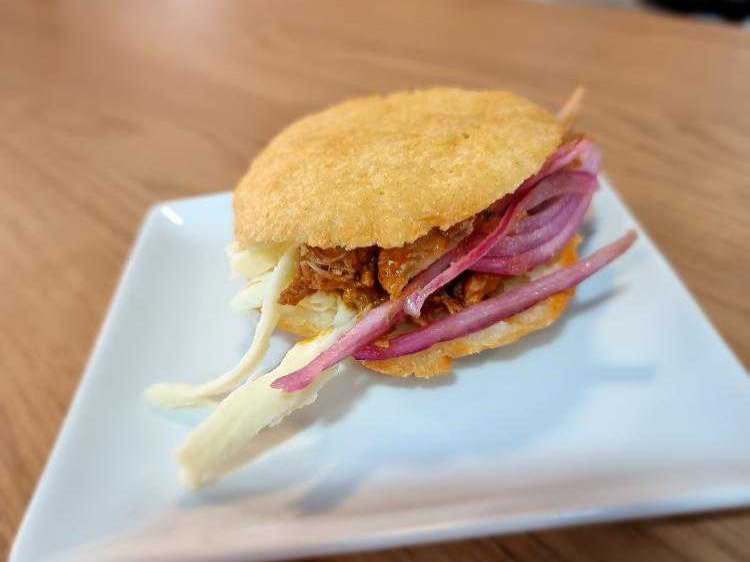 Este pincho es una interpretación moderna de la clásica sardina a la brasa. La base crujiente de galleta salada so...Leer másTortita de maíz rellena de carne de cerdo cocinada a fuego lento con cebolla encurtida. Viva San Fermín (Pamplona)